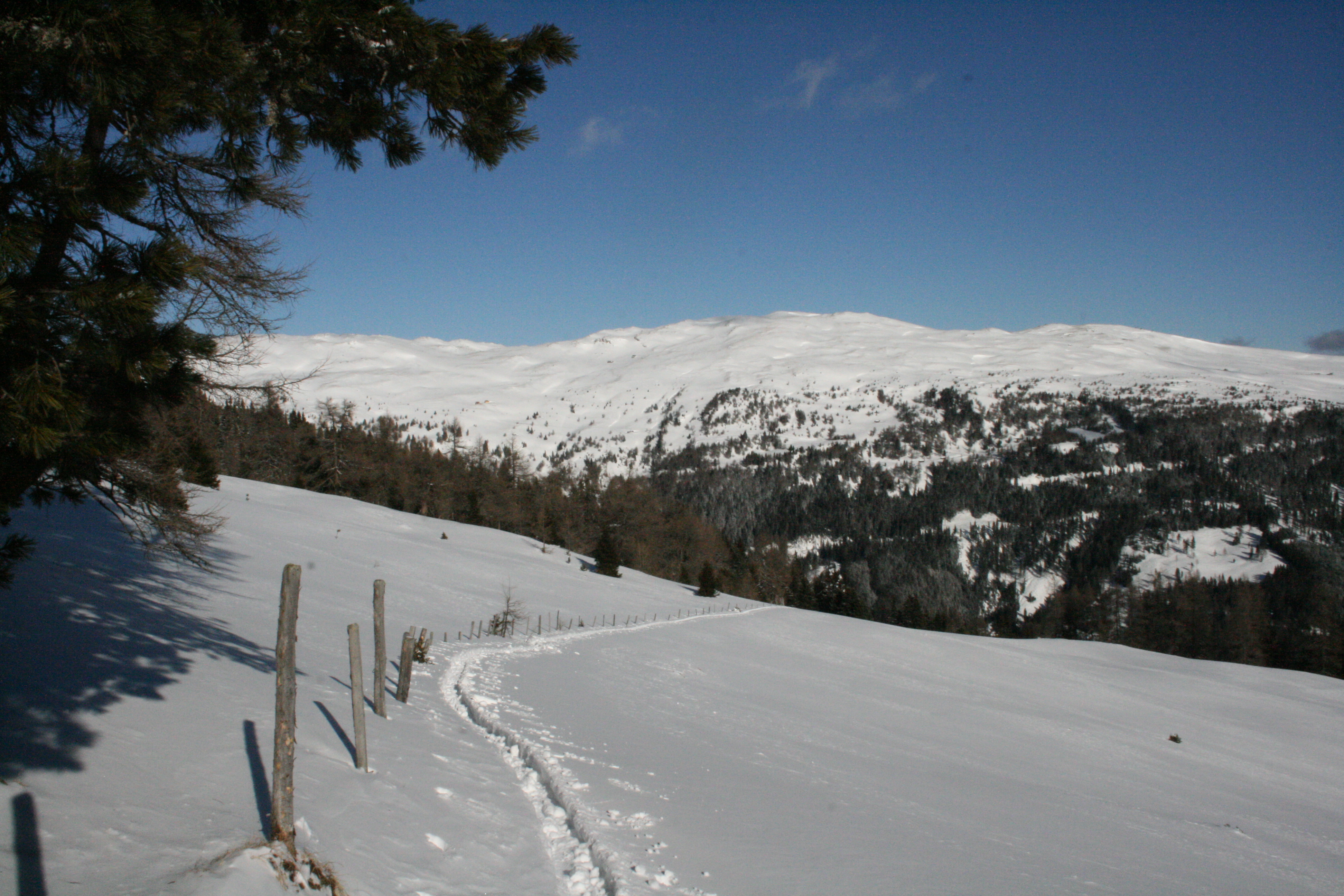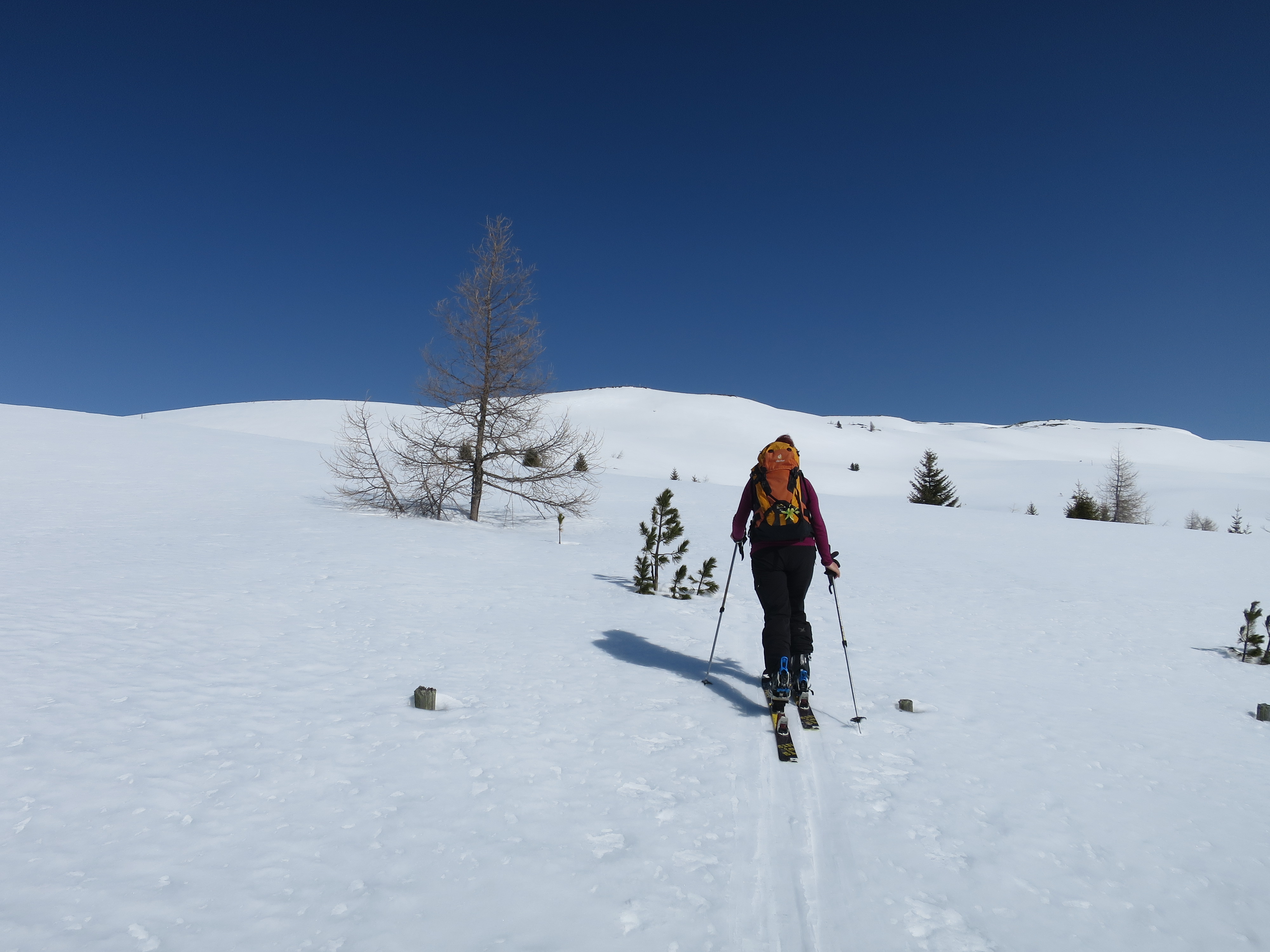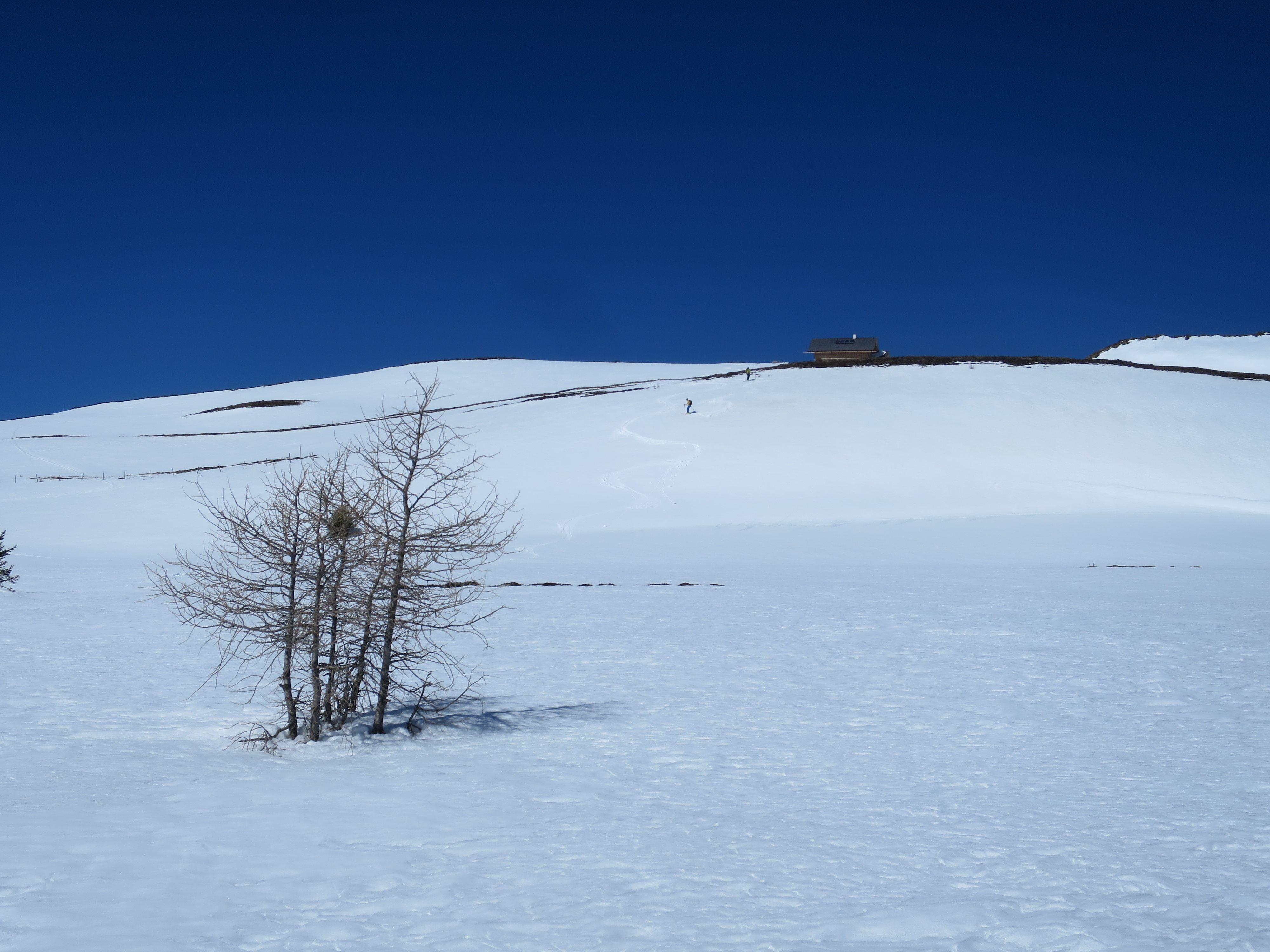Kadar pa je snega v dolini premalo, lahko izkoristimo smučarsko progo. Sledimo ji dokler ne pride na plano malo pred kočo Willi’s Hütte, ki jo na levi strani smučarske proge označuje zvon. Od tam prečimo rahlo levo navzgor, enako kot v prejšnjem primeru.