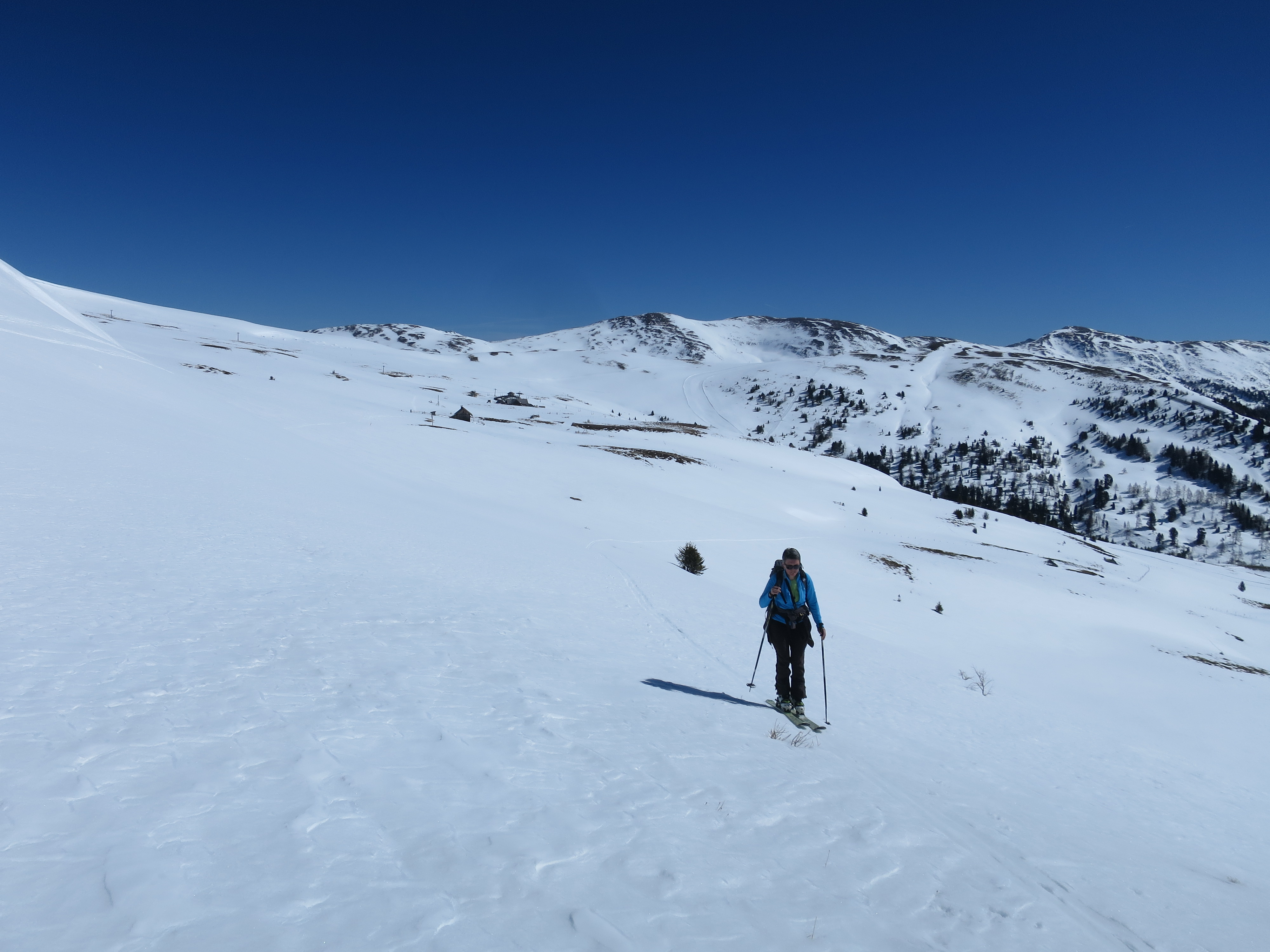 Spust: Z vrha smučamo mimo omenjene koče ter nato navzdol le rahlo levo. Na začetku redkega gozda ujamemo smučarsko progo, ki ji sledimo vse do parkirišča.