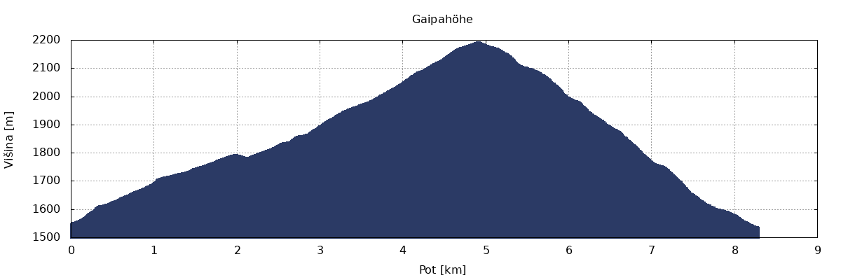 Vzpon: Turo začnemo po smučišču pod sedežnico na Blutige Alm na severni strani smučišča. Če je snega dovolj takoj nad otroško vlečnico zavijemo desno navzgor na kolovoz, ki nas pripelje na neizrazit hrbet s kočo. Po rahlem spustu se zopet dvignemo na prostrana pobočja Blutige Alm. Usmerimo se proti levi, prečimo smučarsko progo ter nadaljujemo v smeri izrazite nove koče, ki je videti, kot da bi bila na grebenu. Za to kočo se svet malo položi, nato pa dvigne proti vrhu Gaipahohe.