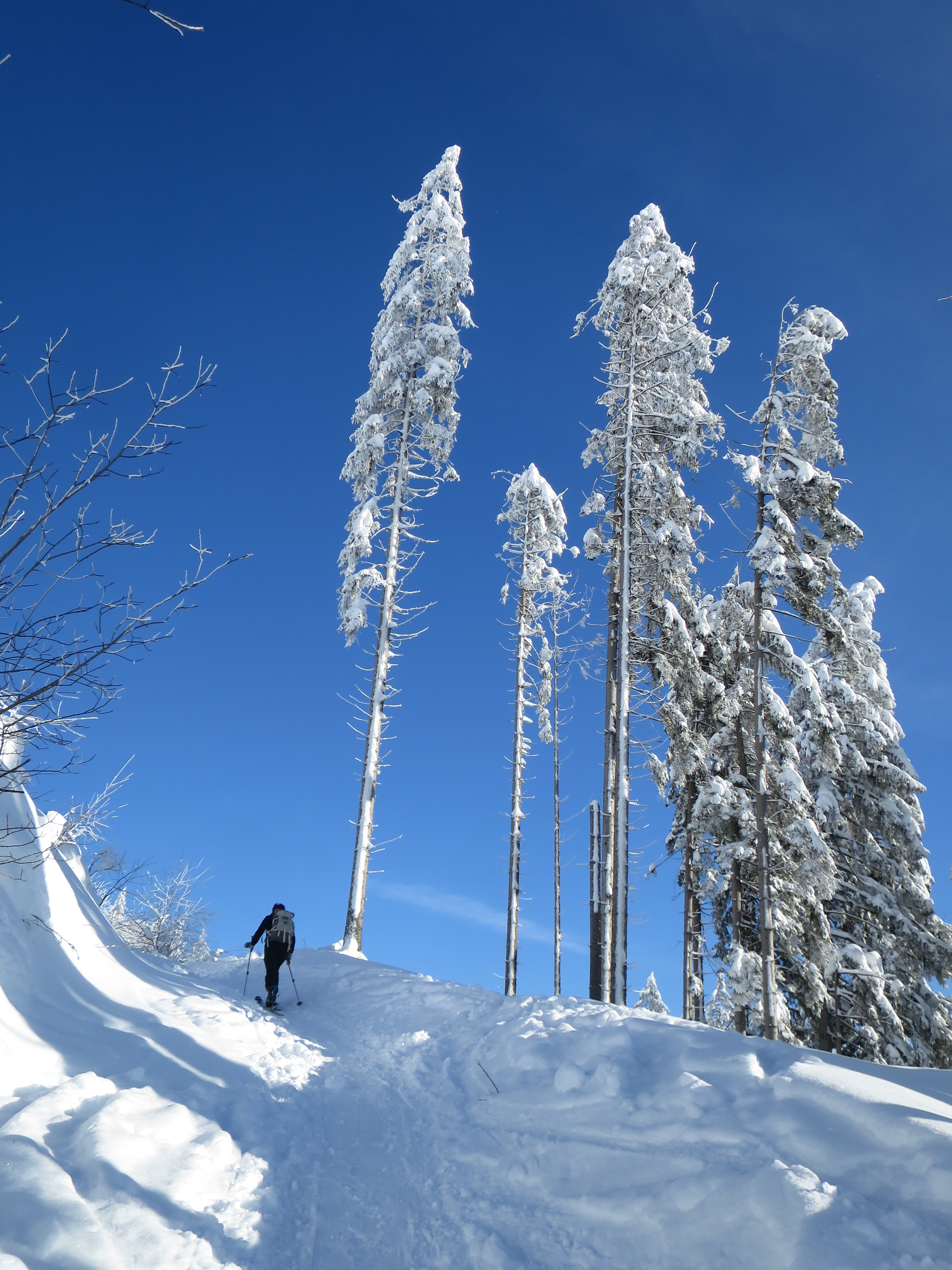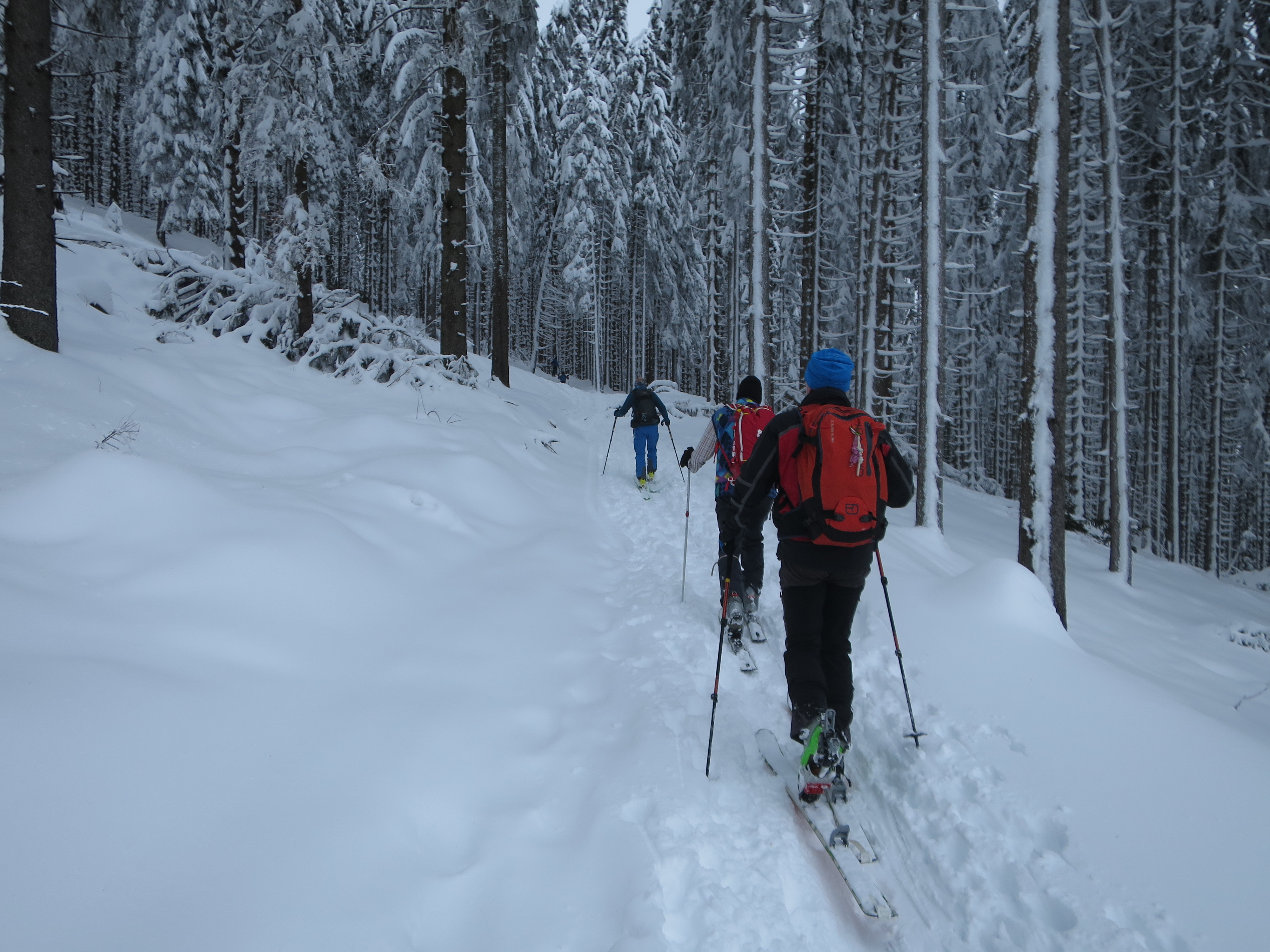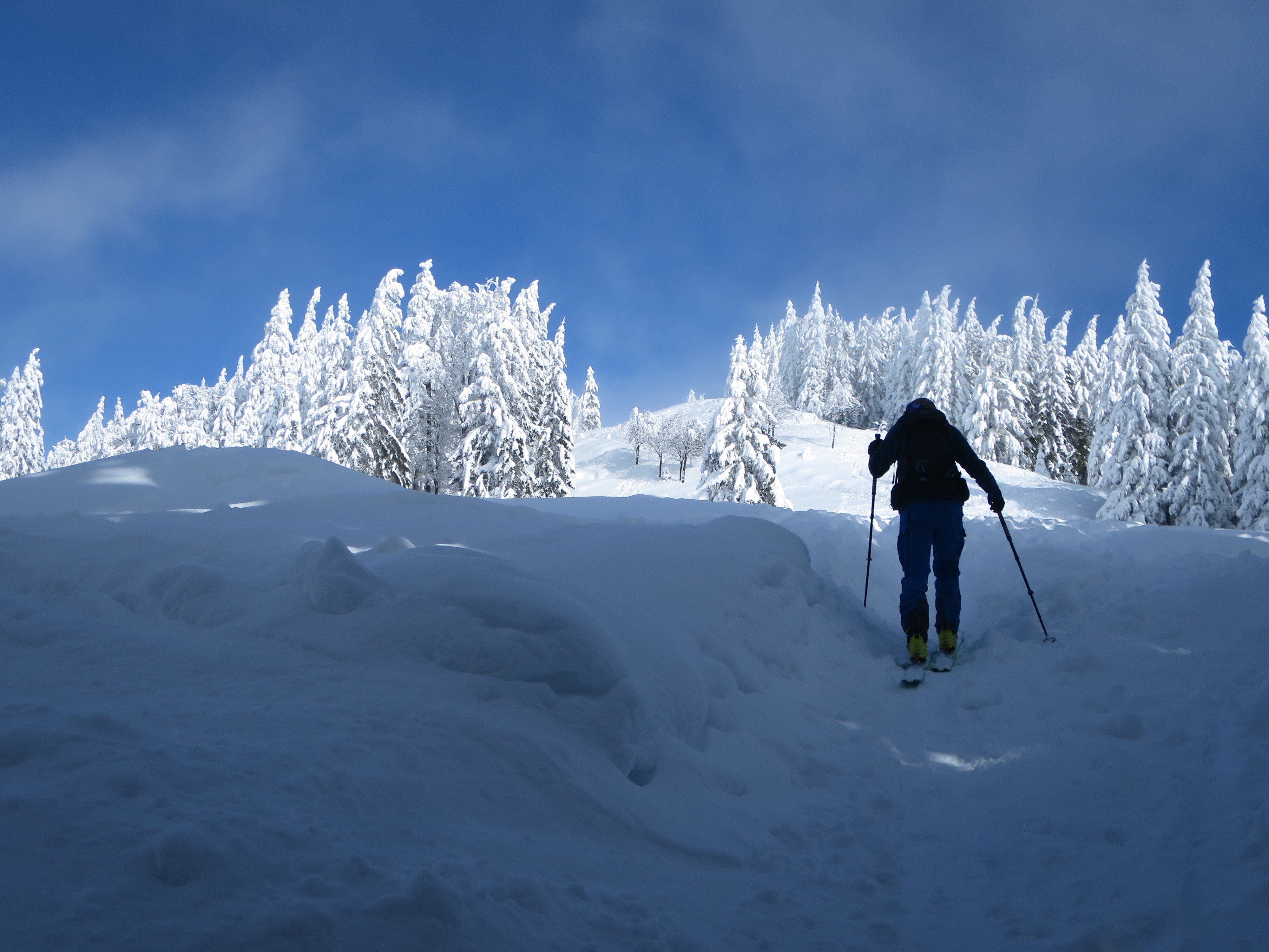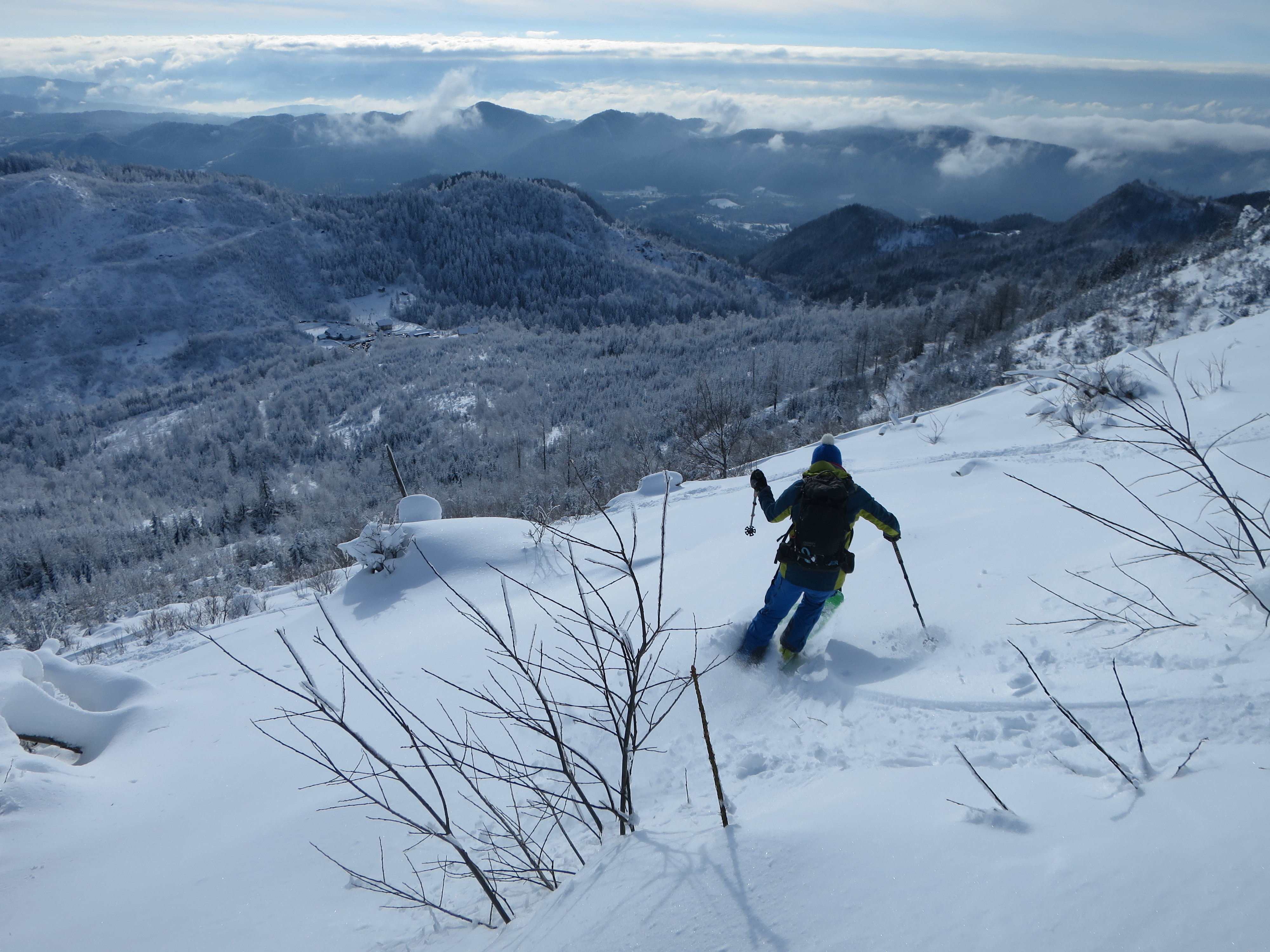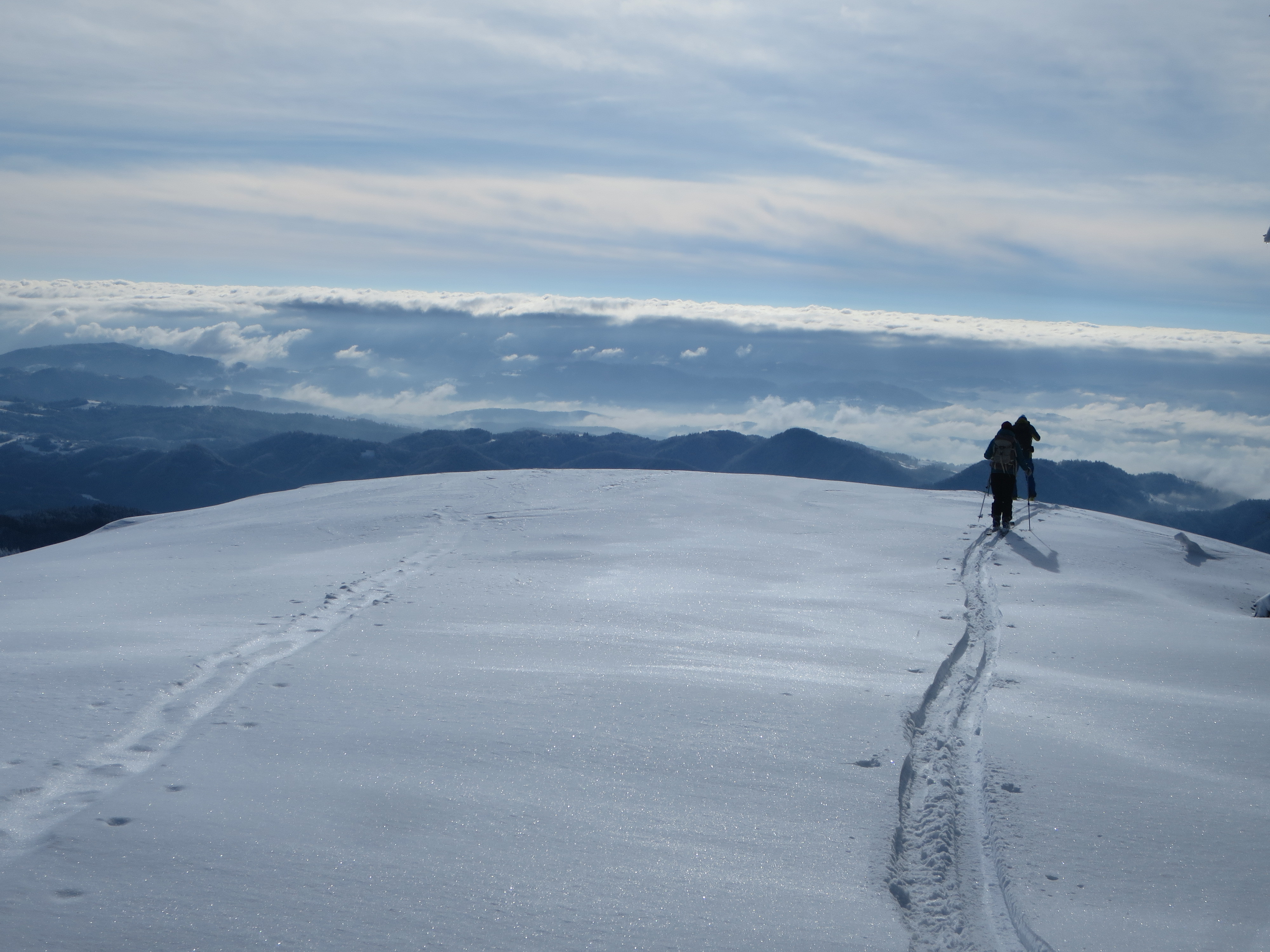 Še lepše pa je, če po spustu preko zgornjega travnika in skozi gozd do sedla imenovanega Na Križu (1238 m) ponovno namestimo pse na smuči in se skozi redek gozd vzpnemo približno 100 metrov na vrh Plešivca. Od tam smučamo še malo po grebenu ter nato levo po več ali manj odprtem terenu vse do pristopne ceste in po njej do izhodišča. Ob tem lahko presekamo še kakšen cestni ovinek.