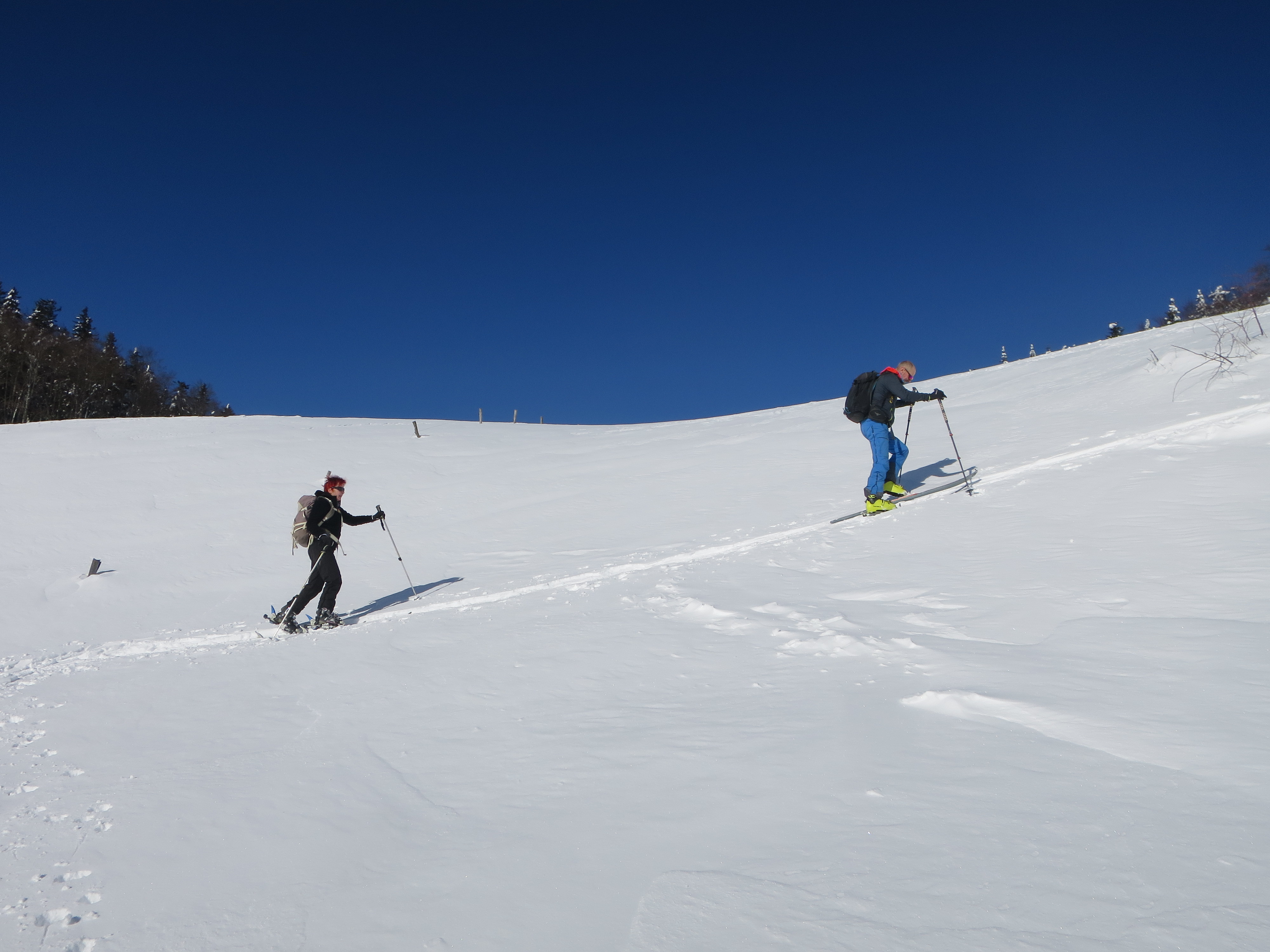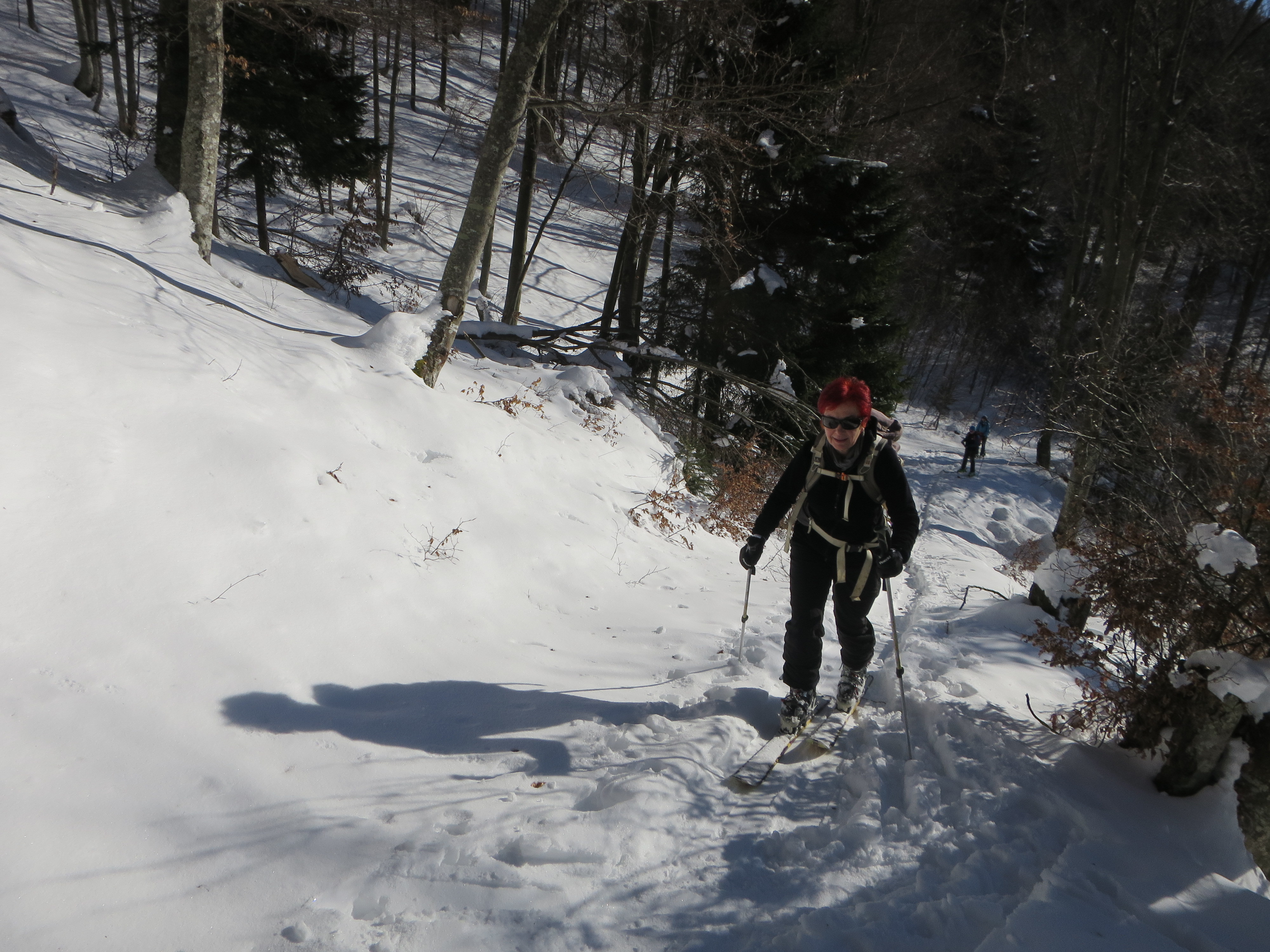 Spust: Smučamo lahko pretežno v smeri pristopa, pri čemer se poskušamo držati čim manj poraščenih pobočij. Še najbolje pa je, če se z vrha usmerimo bolj desno (zahodno) od pristopne smeri in tam izkoristimo gozdne ceste ter goličave.