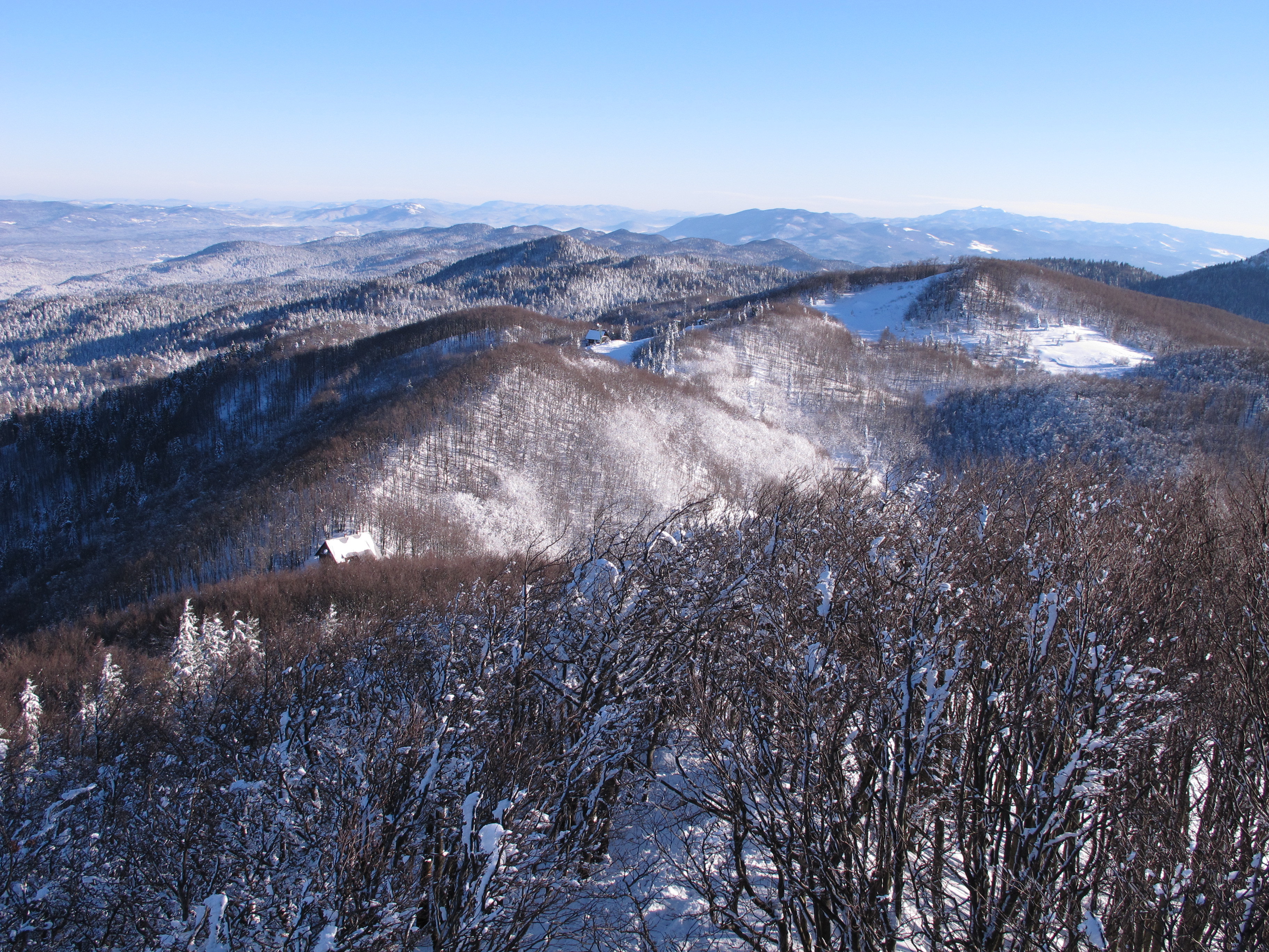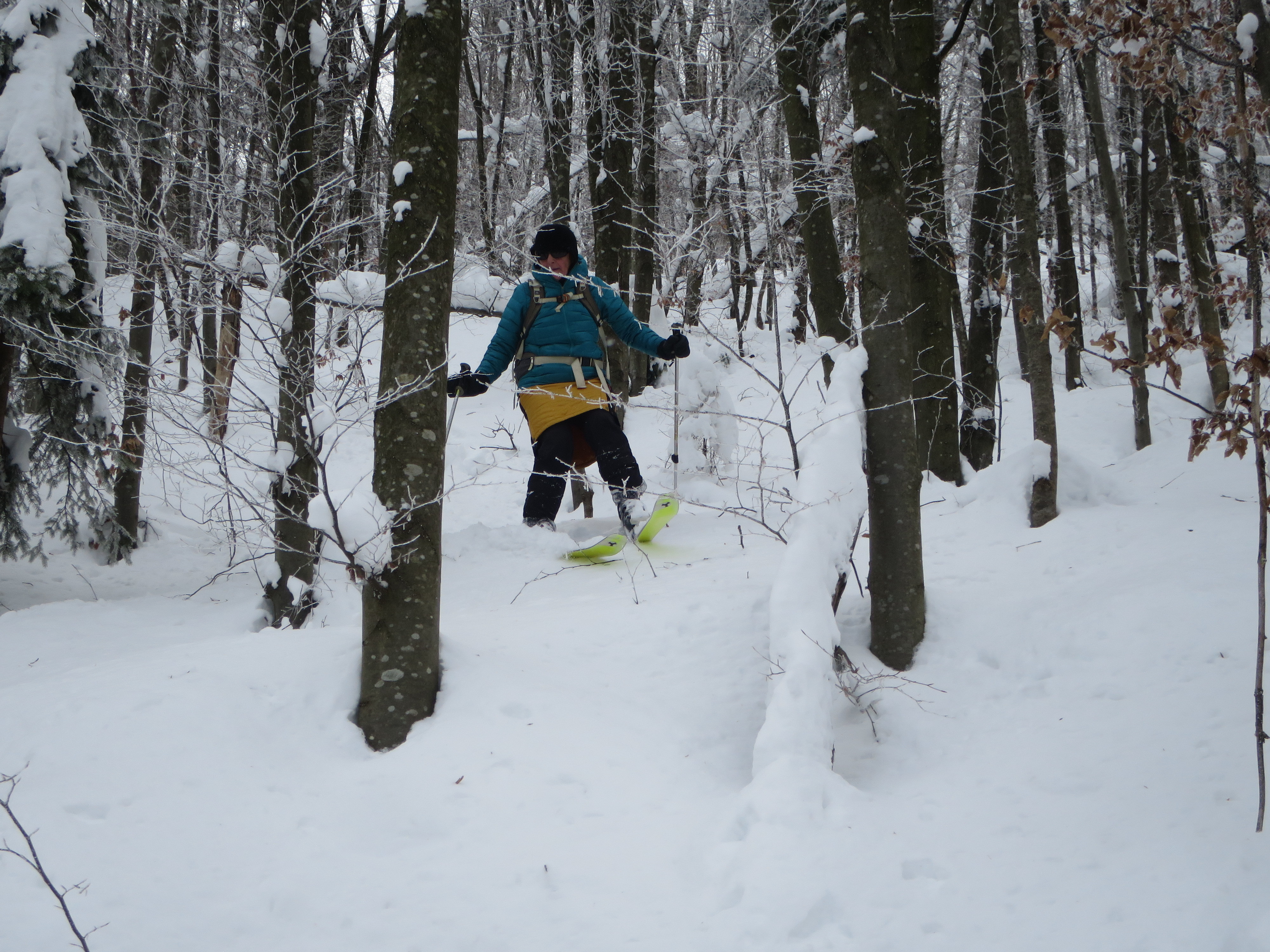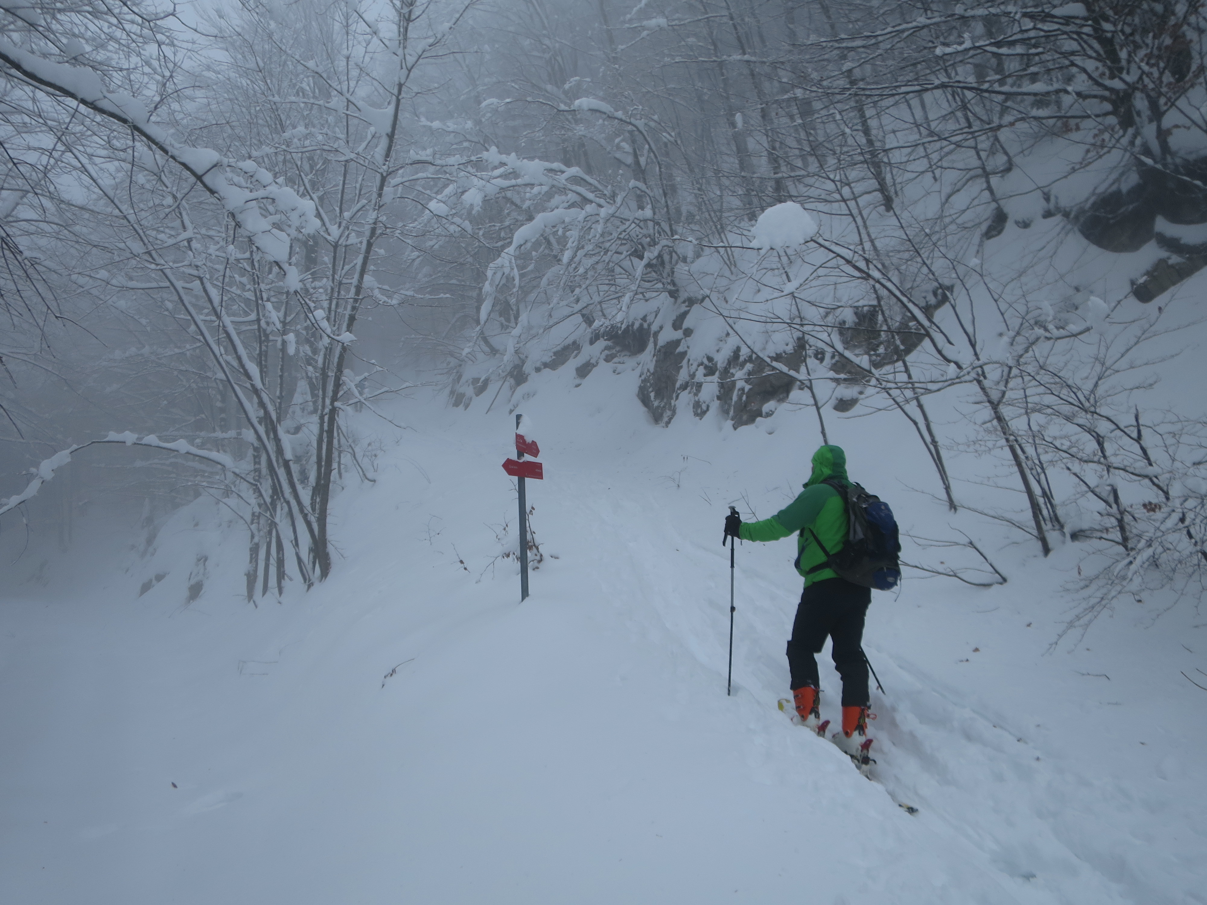 Spust: Z vrha smučamo najprej še malo proti zahodu v smeri grebena in ko najdemo primerno redek gozd mu sledimo navzdol. Ko srečamo pristopno pot ji malo sledimo v levo, a se kmalu odločimo za smučanje desno skozi gozd. Če smo bili uspešni lahko brez težav prismučamo vse do travnika nad avtomobilom.