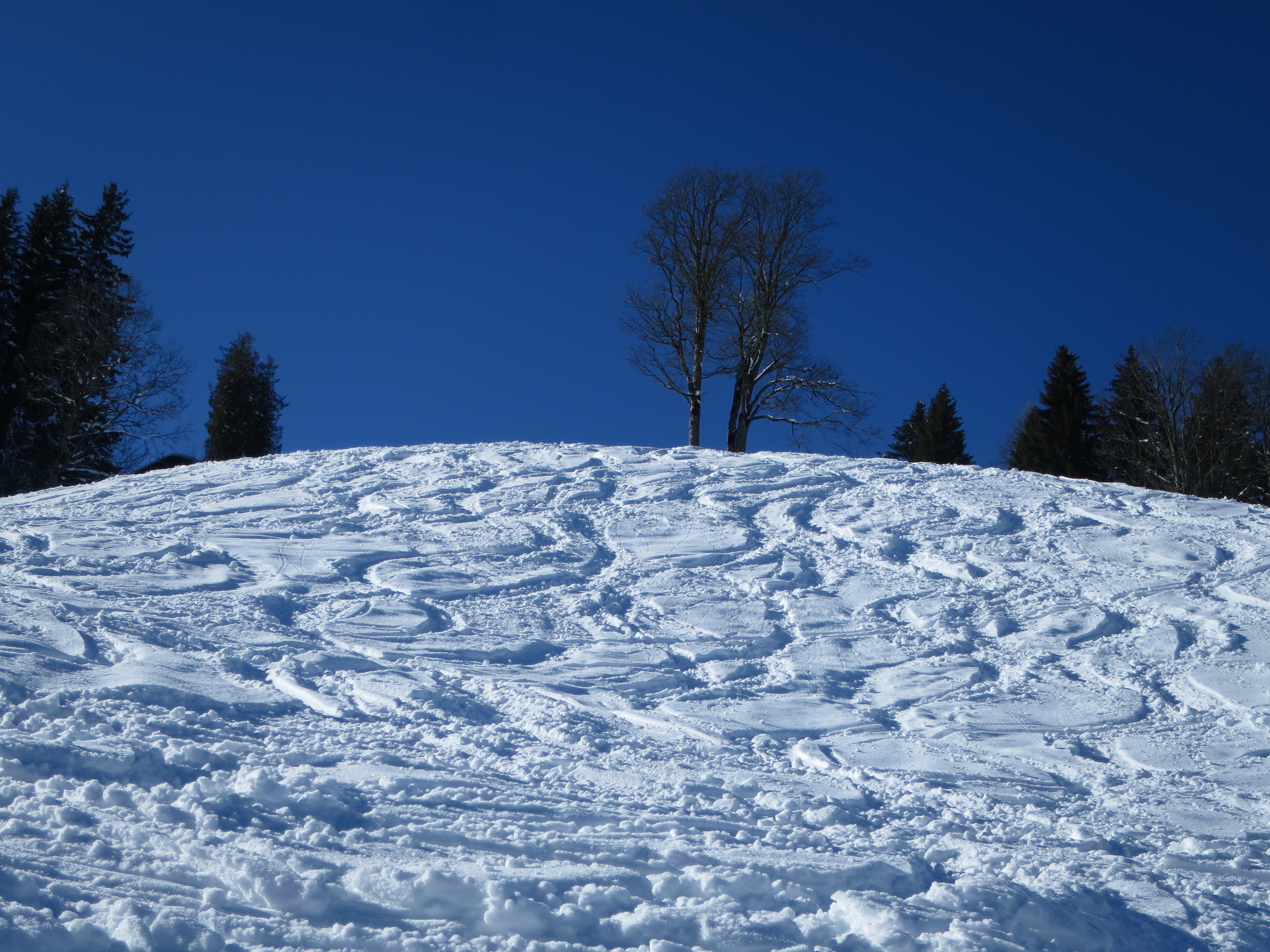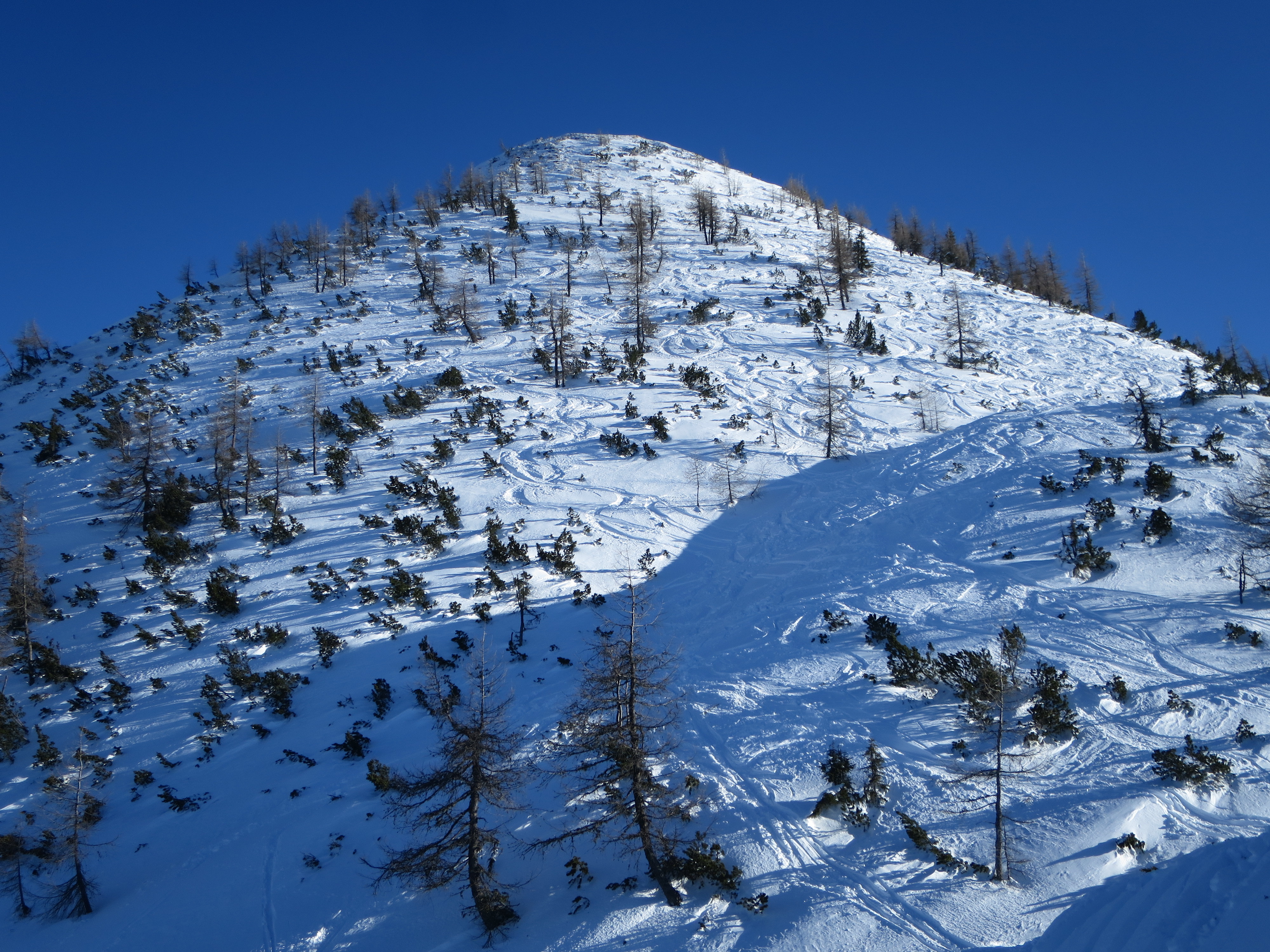 Vzpon: Ob parkirišču stopimo na smuči, gremo za gostilno in navzgor preko zasneženih travnikov do manjšega gozda. Skozenj pridem ponovno na travnik in do sedla Eibenberg, kjer je gostilna Sattelbauer. Nadaljujemo levo skozi gozd po strmejšem kolovozu do ceste. Tej lahko sledimo, še lepše pa je, če se odločimo za bolj strmo peš pot, ki preseka ovinke. Končno se nam odpre planina Lacken s katere se že odpirajo prostrani razgledi. Prečimo planino in se nato vzpnemo v okljukih na vrh, ki je viden pred nami. Če je področje poledenelo ali če ni dovolj snega, ki bi pokril rušnata pobočja, je tu potrebno pametno izbirati smer vzpona.