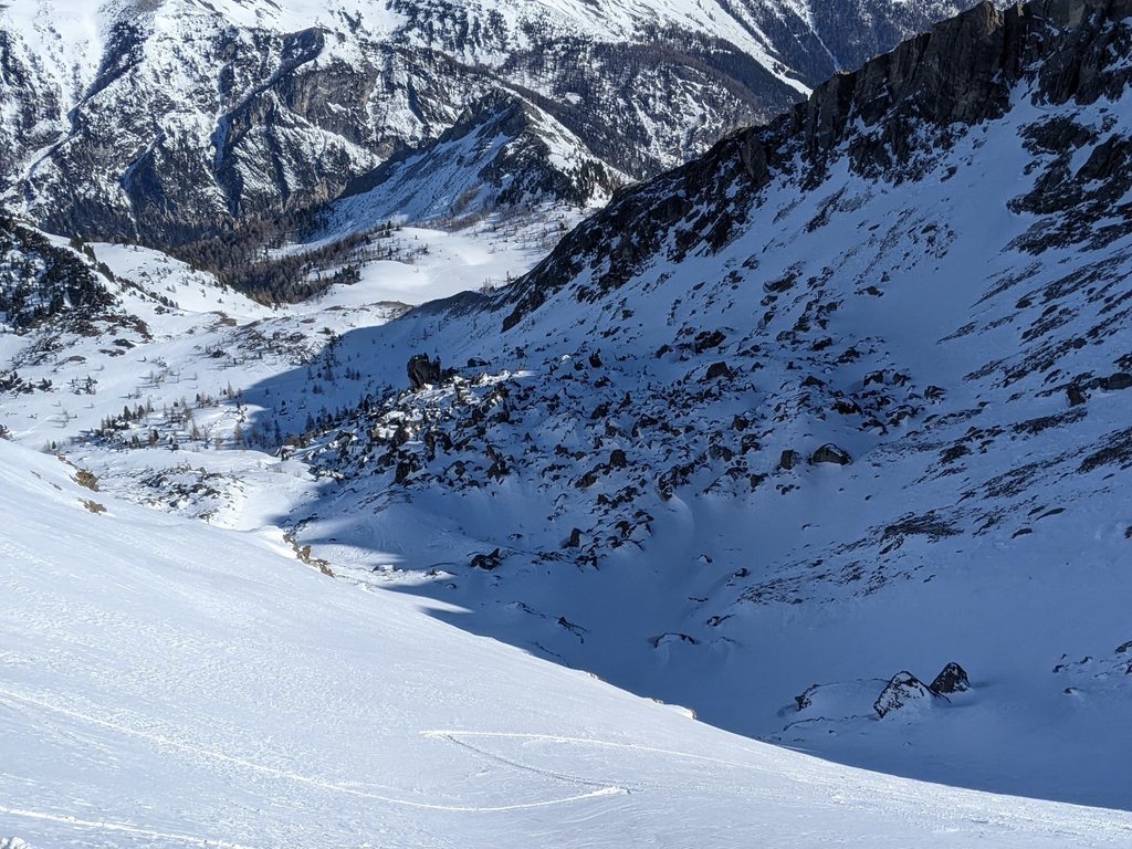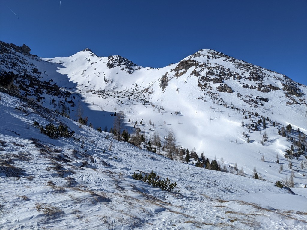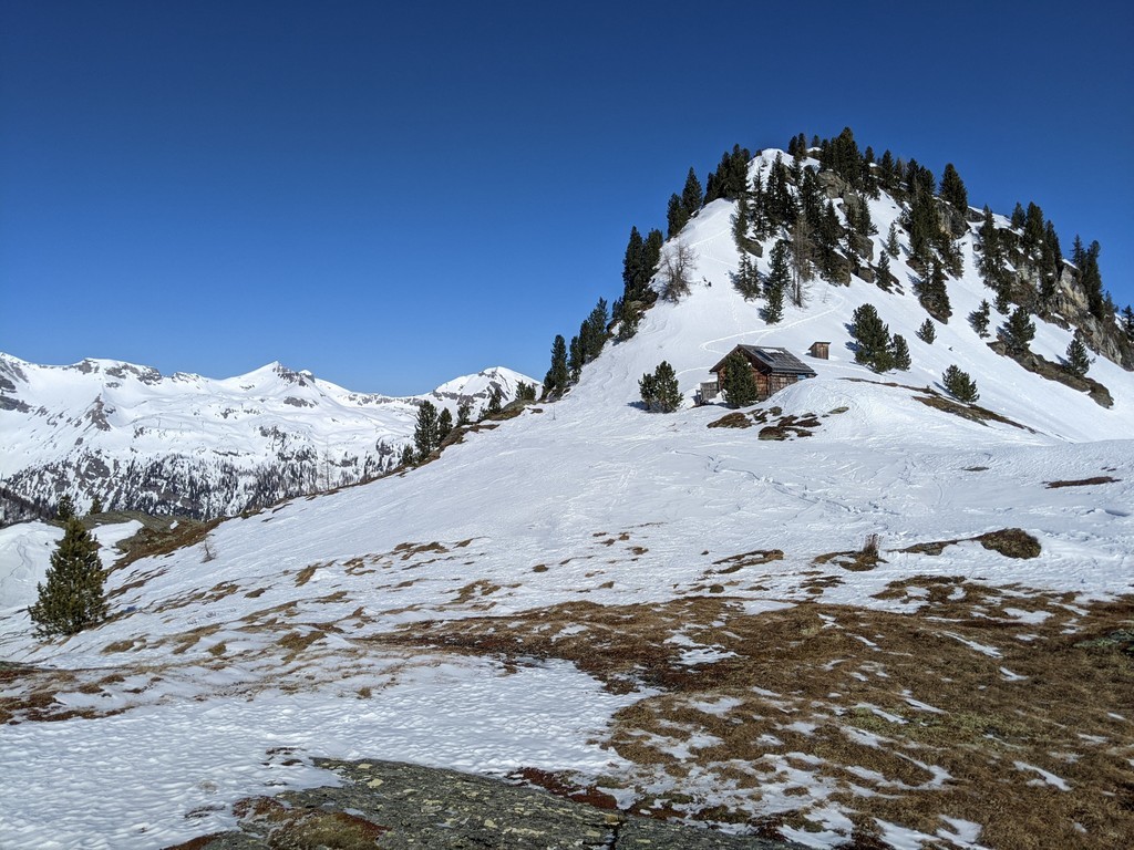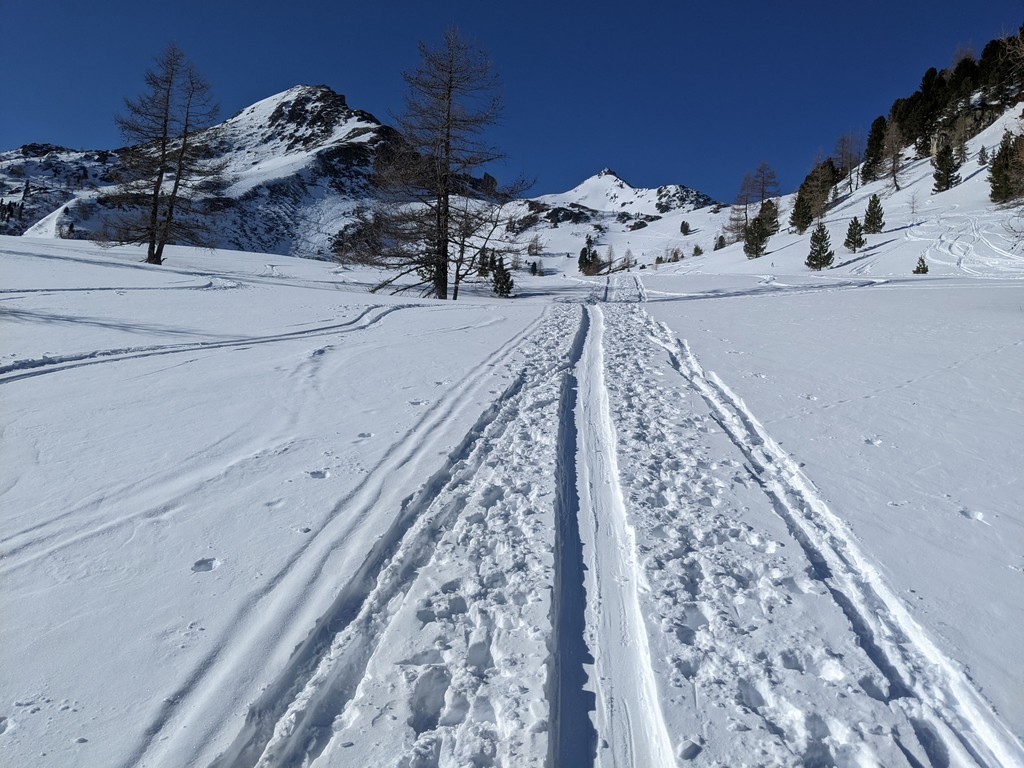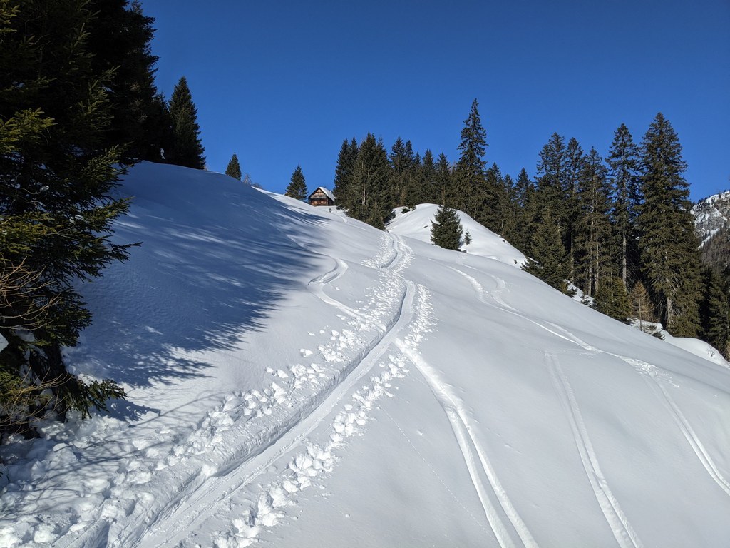Smučamo v smeri vzpona. Najlepše je smučati do konca dolinice pod majhno kočo in se nekaj metrov vzpeti na sedlo do koče.