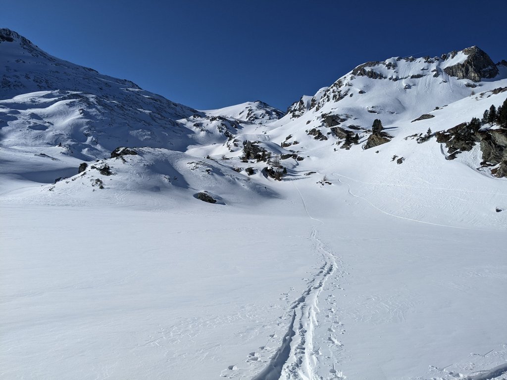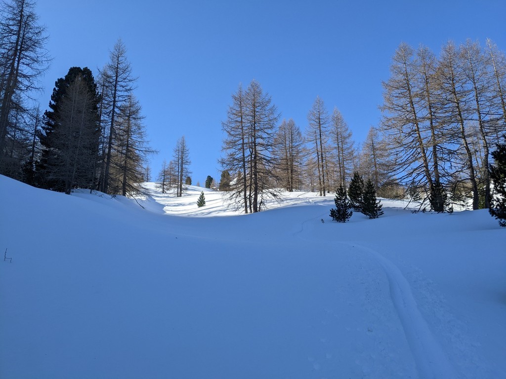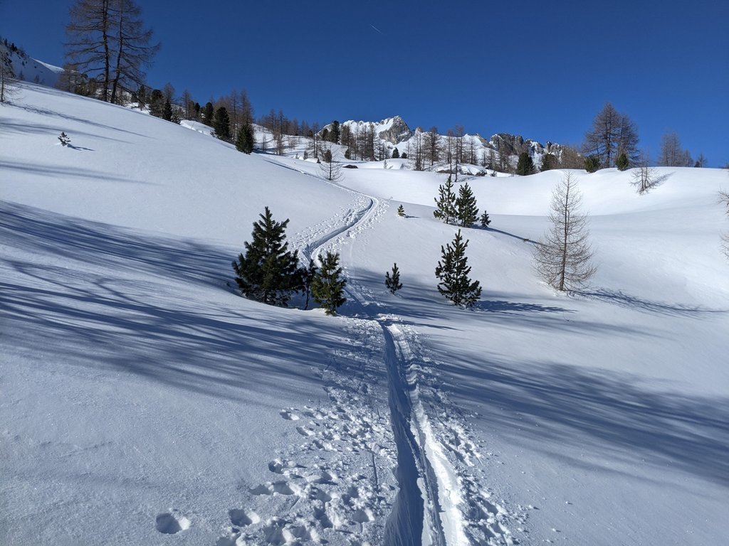 Spust: Smučamo v smeri vzpona. Iz ceste je na višini 1500m možen spust po lepem travniku, potem pa zahtevno po grapah skozi gozd do ceste, ki nas ob potoku privede do parkirišča.
