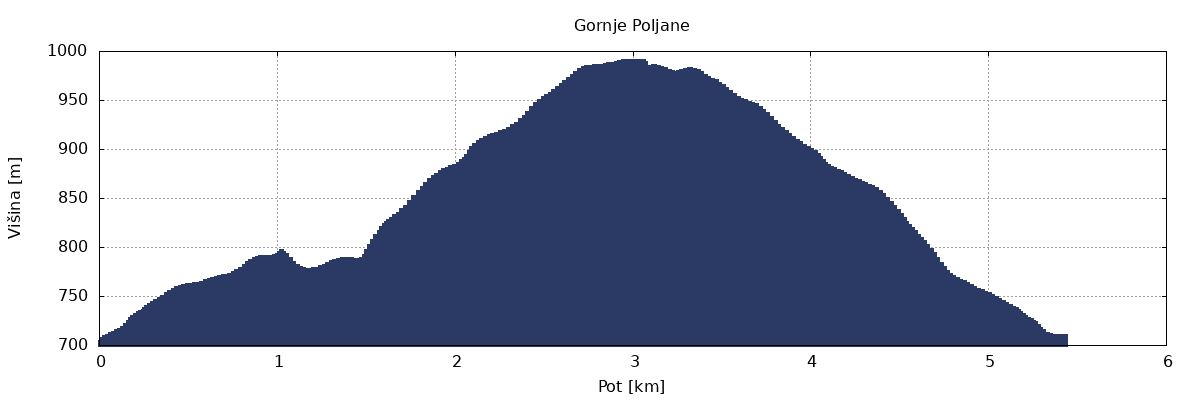 Vzpon: Od izhodišča gremo po gozdni cesti 700 m, nato levo po gozdni vlaki navzgor še 500 m, da dosežemo markirano pot. Na odcepu krenemo v desno postrani po pobočju do bolj ravnega terena, kjer pot zavije na levo in nas čez več položnih jas pripelje do zaselka Gornje Poljane. Mimo pohodne domačije pri Hostovih se lahko vzpnemo še na cervico Sv. Andreja, 1066 m.