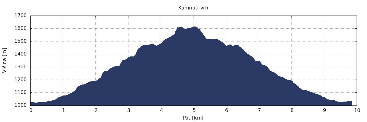 Vzpon: Večji del ture do višine ca. 1550 m poteka po gozdnih cestah, krajši odsek do planine Rekaršica (1549 m) še skozi gozd po markirani poti, nato se svet odpre. S planine nadaljujemo po zgornji cesti, ki se v polkrogu dviga proti severu. Pri kažipotih na grebenu zavijemo skoraj za 180° v desno in se ne prestrmo vzpnemo med razmaknjenimi smrekami po grebenu na položen vrh. Razgledov na njem ni, treba se je za nekaj 100 m blago spustiti po grebenski jasi proti vzhodu in na neizrazitem sedlu iti še nekoliko navzdol proti jugu, ko se drevje razmakne in odpre panorama Julijcev.